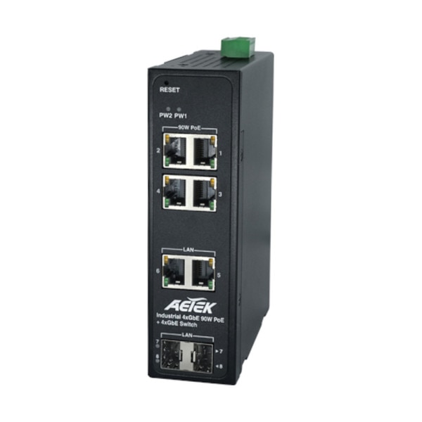 GbE Industrial switch 4*90W bt PoE, 2*SFP, 2*RJ45 Total power budget: 360W 6KV PoE surge protection Operating temperature: -40°C ~ 75°C