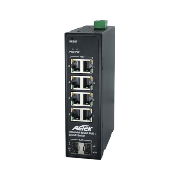 GbE Industrial switch 8*30W PoE, 2*SFP Total power budget: 240W 6KV PoE surge protection Operating temperature: -40 °C ~ 75 °C